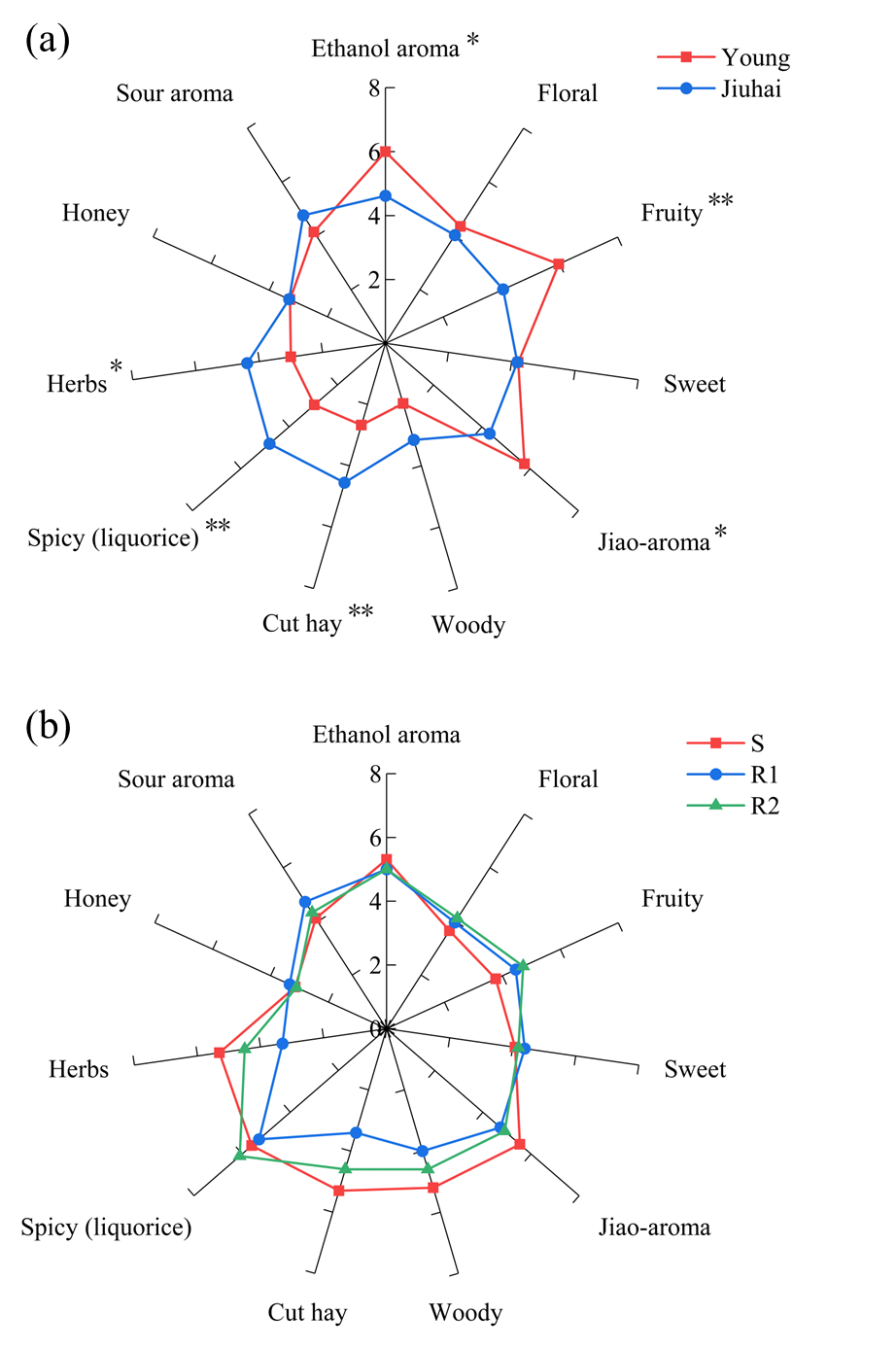 图1新酒与酒海贮酒(a)、酒海贮酒与重组样品(b)的香气轮廓图